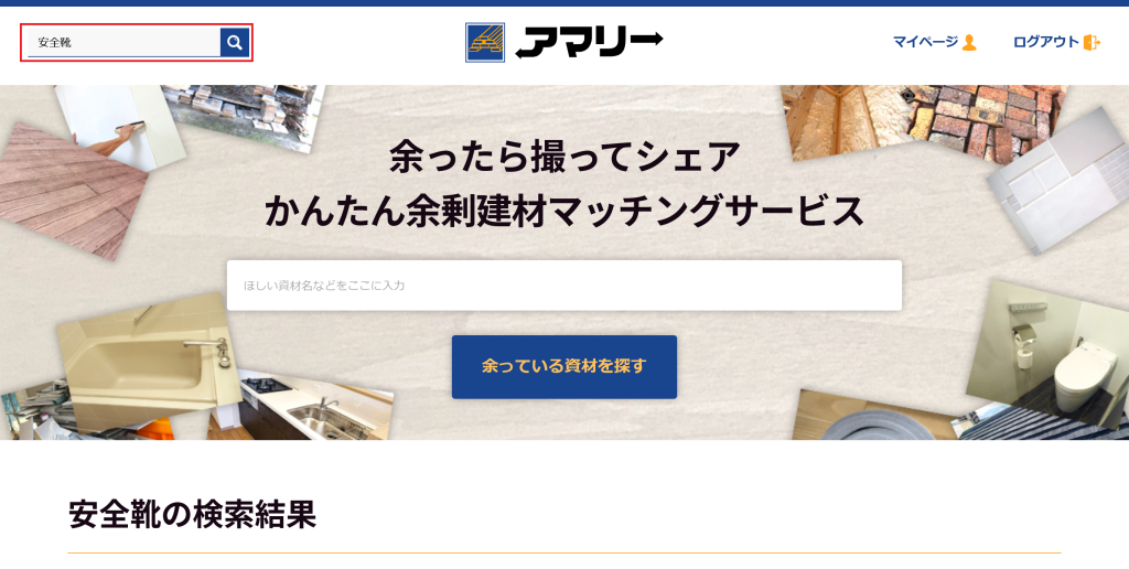 商品の探し方(購入したい) 気になる商品を探す 商品は2つの検索窓とカテゴリー一覧から探すことができます。 1)ホーム画面の「ほしい資材名などをここに入力」に気になる資材名などを入力し(今回は安全靴を検索しています)余っている資材を探すをクリックします。(ホーム画面はこちらから) ホーム画面 2)左上の「キーワード検索」へ気になっている商品などのキーワードを入力し🔍をクリックします。 ホーム画面 3)ホーム画面の一番下へスクロールするとカテゴリー一覧まで行きます。気になるカテゴリーをクリックすると商品を一覧で見ることができます。 カテゴリー一覧